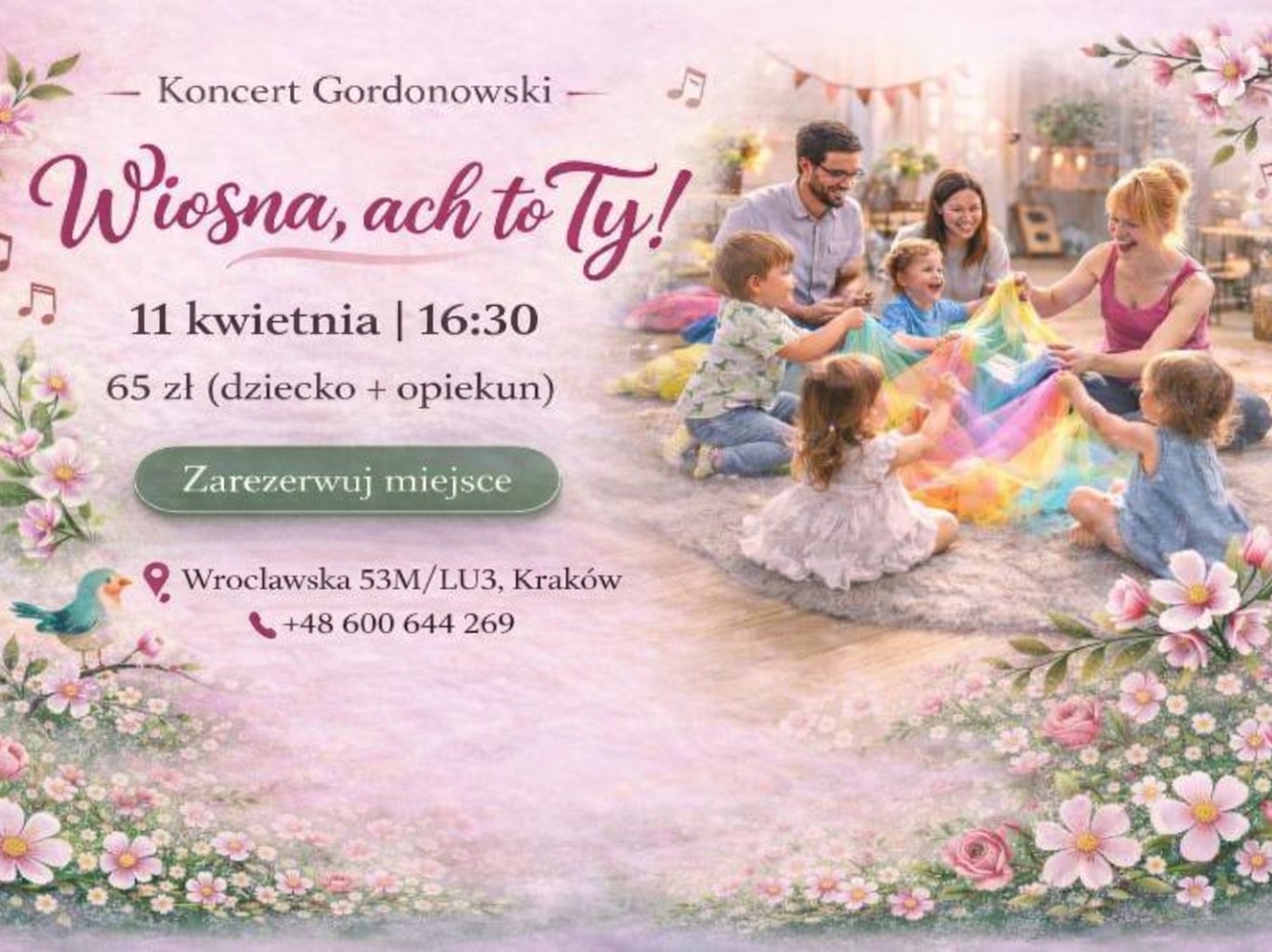 Wiosenne spotkanie pełne muzyki, radości, zabawy i dźwięków budzącej się przyrody, stworzone z myślą o najmłodszych i ich rodzicach.